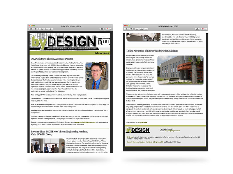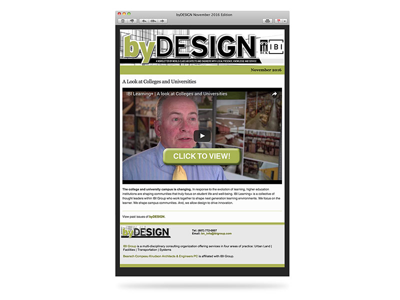 BCK-IBI Group eNewsletter This leading architectural and engineering firm wanted to keep their name in front of key decision makers. Our suggestion: display thought leadership and subtly promote services in the tasteful package of a quarterly e-newsletter. Recent Projects Tanglewood Nature Center & Museum Direct Mail Elmira College “Elmira Everlasting” Direct Mail Sanofi Annual Report TSB Teaoga Development Testimonial CFCU Money Market Campaign Categories Annual Reports Auto B2B Branding / Identity Campaigns Collateral Digital Direct Mail Education Events Financial Fundraising Healthcare Nonprofit Outdoor Retail and Tourism Social Videos ← Maguire Print Ad Design/Co-op Coordination Placid Industries Line Card →