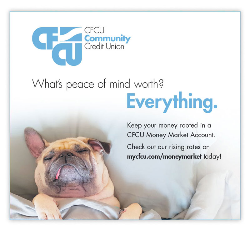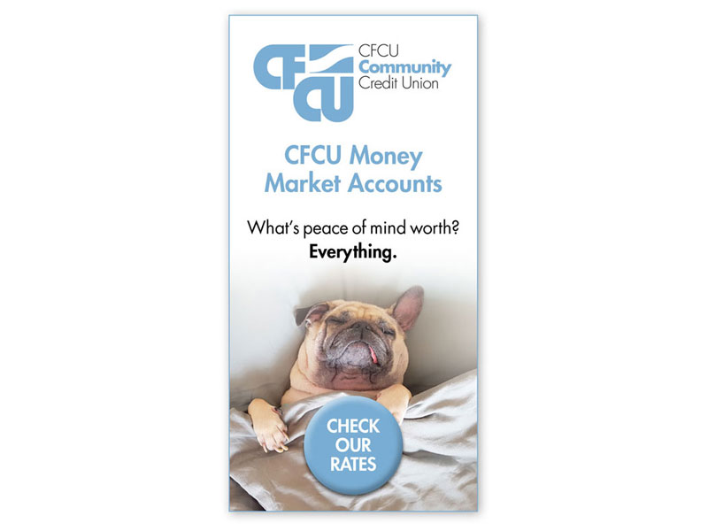 CFCU Money Market Campaign For Ithaca-based CFCU Community Credit Union, an eye-catching dog photo was the perfect complement to their promise of peace in this ad, which promoted the safety of storing your money in a Money Market account. Recent Projects Tanglewood Nature Center & Museum Direct Mail Elmira College “Elmira Everlasting” Direct Mail Sanofi Annual Report TSB Teaoga Development Testimonial CFCU Money Market Campaign Categories Annual Reports Auto B2B Branding / Identity Campaigns Collateral Digital Direct Mail Education Events Financial Fundraising Healthcare Nonprofit Outdoor Retail and Tourism Social Videos ← Lesko Financial Brochure TSB Teaoga Development Testimonial →
