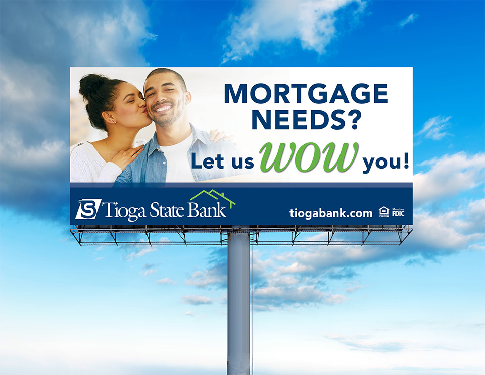 Tioga State Bank “Wow” Mortgage Billboards One of the bank’s core values is to “Wow their customers” with outstanding service and value. This competitive advantage is front and center in this billboard design for mortgages. Recent Projects Tanglewood Nature Center & Museum Direct Mail Elmira College “Elmira Everlasting” Direct Mail Sanofi Annual Report TSB Teaoga Development Testimonial CFCU Money Market Campaign Categories Annual Reports Auto B2B Branding / Identity Campaigns Collateral Digital Direct Mail Education Events Financial Fundraising Healthcare Nonprofit Outdoor Retail and Tourism Social Videos ← Lackawanna County Community Fundraiser Materials Community Foundation for South Central New York “I Can’t Stand By” Campaign →