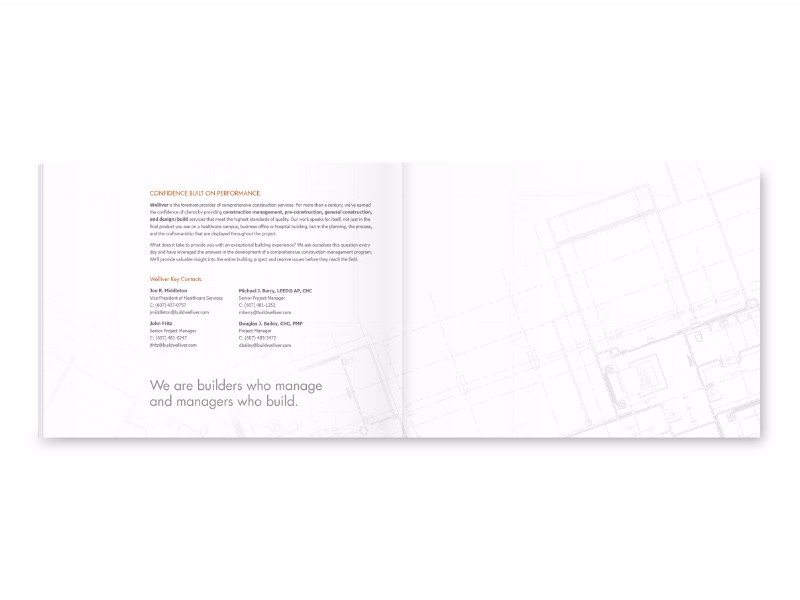 Welliver Brochure Welliver has been constructing healthcare buildings for 120 years, but needed a piece to dynamically tell the story of their experience and expertise. We gave them a confident, clean design with plenty of white space. Recent Projects Centralus Health Media Buying Centralus Health New Movers Direct Mail Elizabeth Seton Children’s Eblast Graphics and Social Media Ads Tanglewood Nature Center & Museum Direct Mail Elmira College “Elmira Everlasting” Direct Mail Categories Annual Reports Auto B2B Branding / Identity Campaigns Collateral Digital Direct Mail Education Events Financial Fundraising Healthcare Media Buying Nonprofit Outdoor Retail and Tourism Social Videos ← eni Capabilities Brochure The Agency LinkedIn Ads →